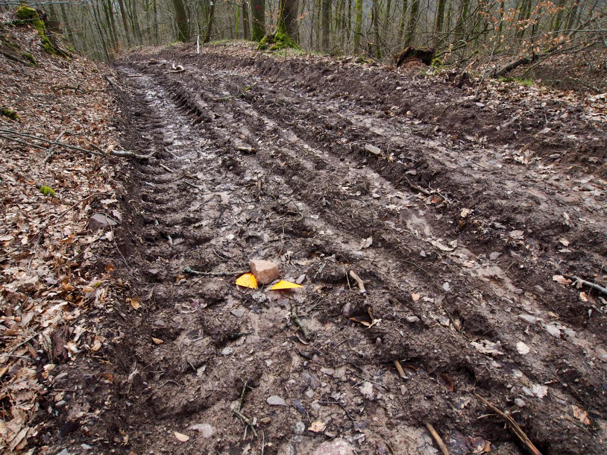 SaarForst im Einsatz: Tiefe Maschinenspuren und Holzernte-Schäden nach Holzernte (Verjüngung - überwiegend Laubbäume) in kritischer