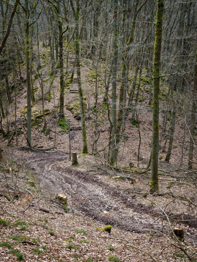 SaarForst im Einsatz: Tiefe Maschinenspuren und Holzernte-Schäden nach Holzernte (Verjüngung - überwiegend Laubbäume) in kritischer Hanglage.