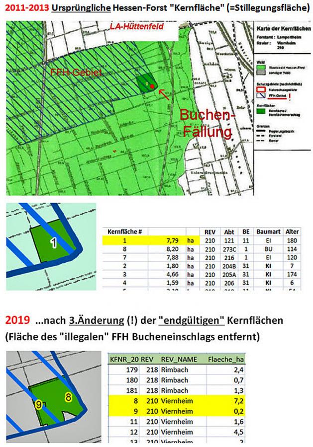 Also änderte das Forstamt Lampertheim einfach später die Kernflächenkarte ab, nahm die erfolgte Bucheneinschlagsfläche dort einfach heraus. Pragmatisch.