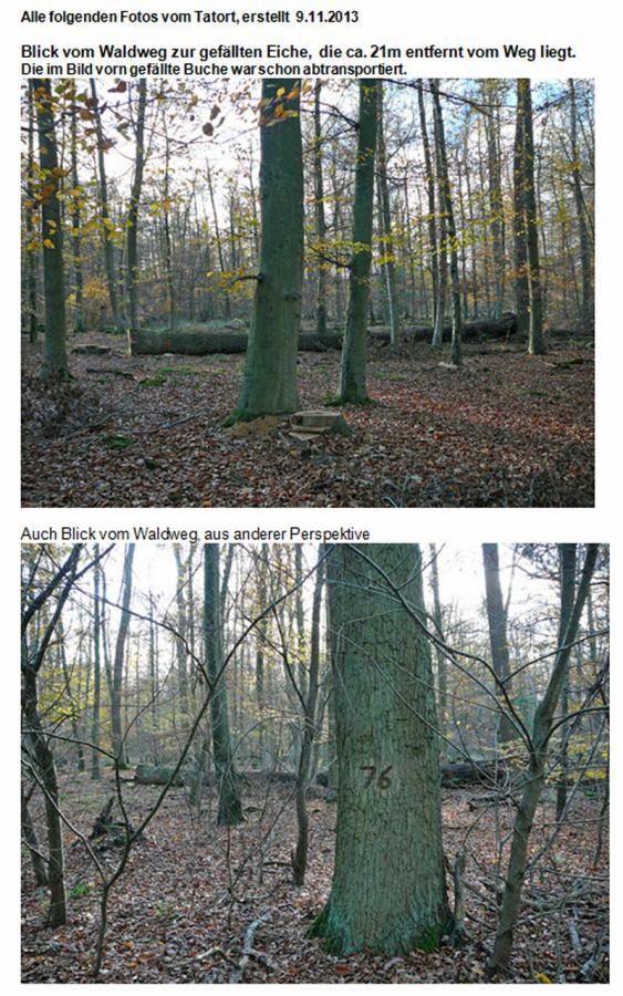 Die gefällte Eiche lag nicht direkt am Waldweg, sondern ca. 21 m vom Weg in den Wald hinein.