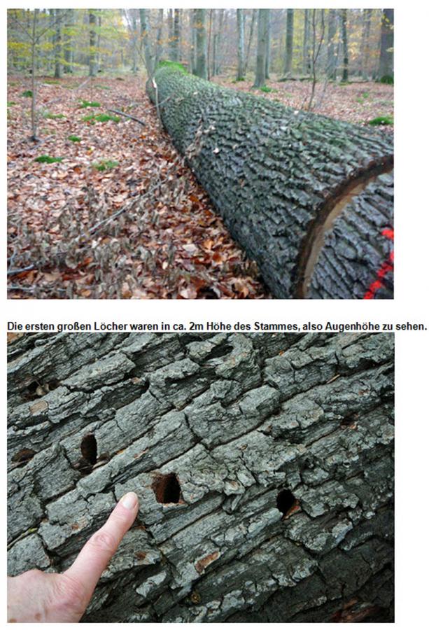 Schon in 2m Baumhöhe, also Augenhöhe, konnte man etliche ca. 1- 1,2 cm große Löcher sehen manche auch länglich, siehe Fotos. Die Löcher waren in größerer Baumhöhe noch häufiger zu finden.