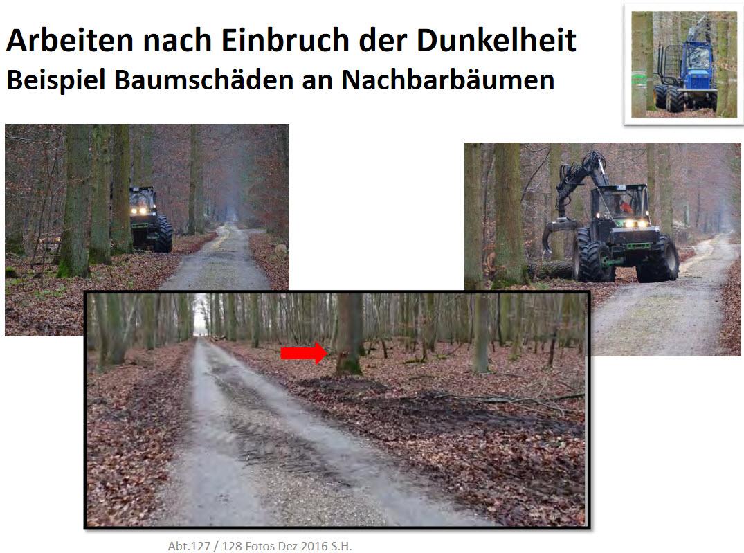 Vermeidbar wären die Schäden gewesen, die nach Anbruch der Dunkelheit angerichtet wurden. Denn es wurde auch noch im Dunkeln mit Harvestern und Maschinen im FFH Buchen-Eichenwald zu dicht an wertvollem Baumbestand herumgekurvt.