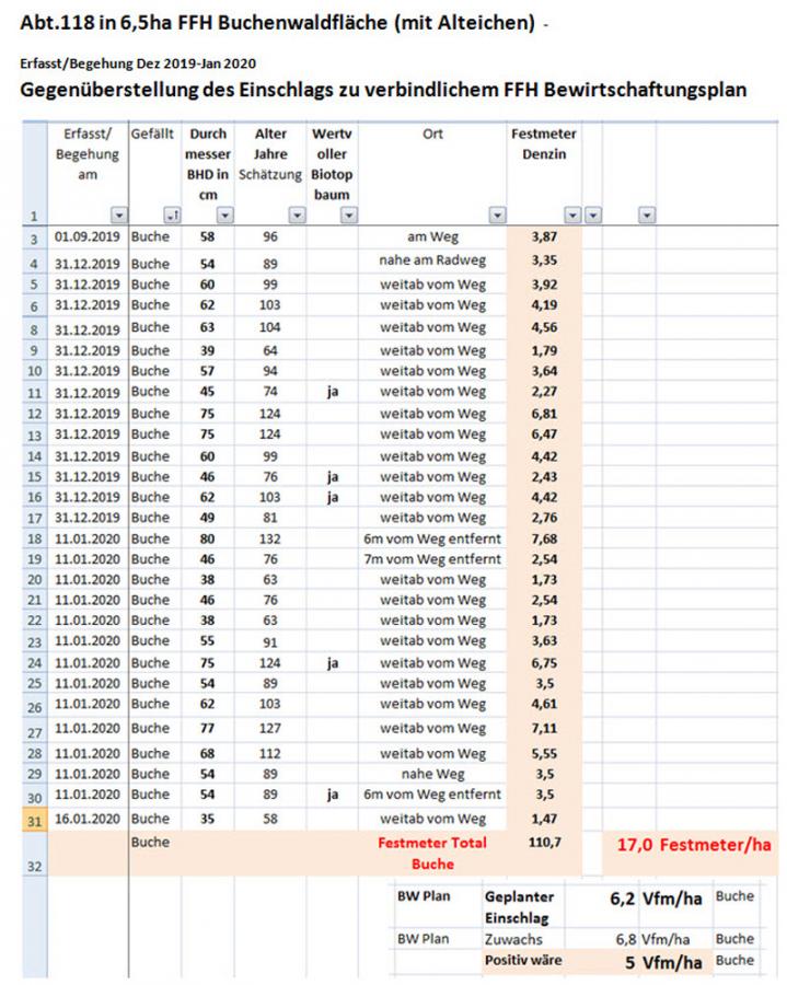 Fazit: Der FFH Bucheneinschlag in Abt.118 war ca. 3x (!) so hoch wie im BW-Plan vorgegeben.
