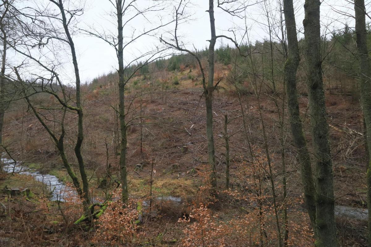 Auf einer Hangfläche von ca. 1,75 ha erfolgte eine ältere und eine neuere Baumfällung. Der Hang grenzt direkt an ein Naturschutzgebiet und Flora-Fauna-Habitat mit der "Laasphe". Inwieweit das Bachgebiet betroffen ist, kann nicht gesagt werden. Die Fotos ..1340, ..1341.. und ..1342 können zu Rate gezogen werden.