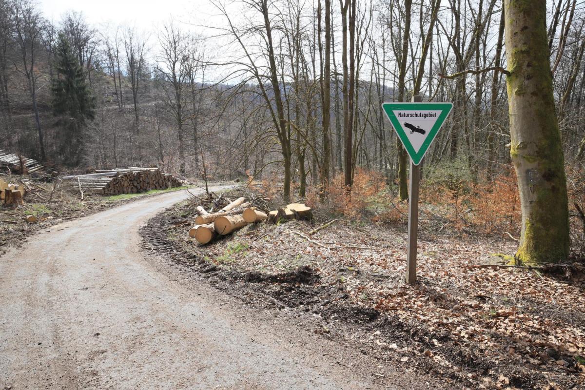 Einzelbaumfällung direkt neben NSG-Hinweisschild "In der Weidetal", neben Wildwiese, sowie Lagerung von einigen weiteren Bäumen.