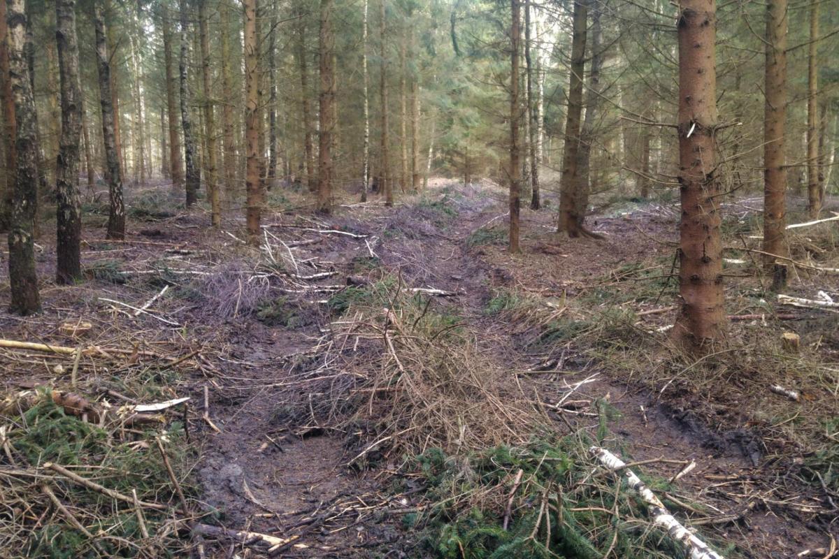 Der Bestand wurde vor kurzem (zwischen Oktober 2019 und Januar 2020) mit Rückegassenabständen von bis zu 20 m erschlossen sowie leicht maschinell durchforstet.