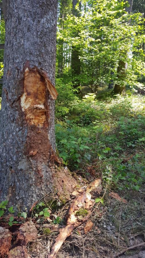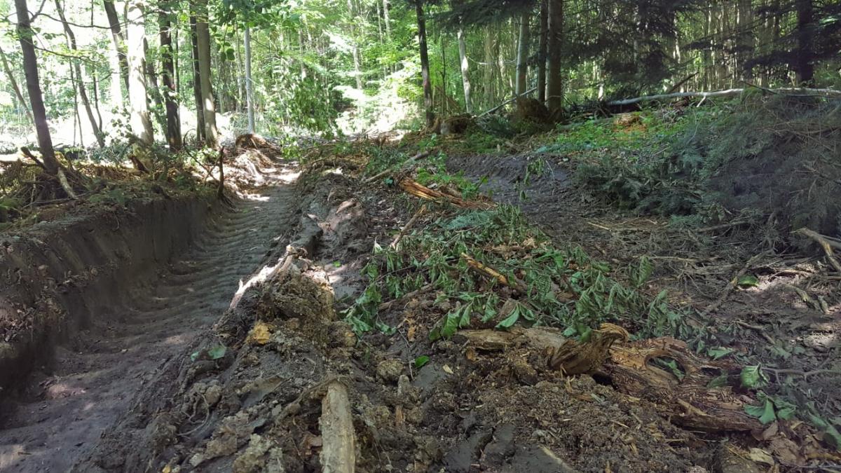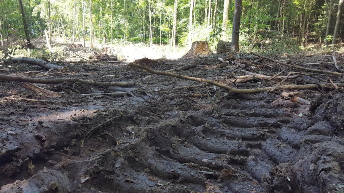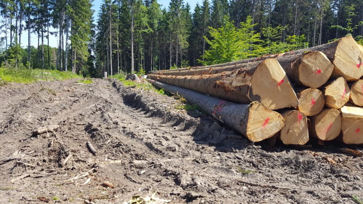 Holzernte im Staatsforst Ende Mai mit ausgeprägten Bodenschäden durch schweres Erntegerät sowie gravierende Verletzung der im Bereich der Rückegassen befindlichen Bäume. Bei genauer Inspektion der gefällten Bäume, war nur ein Nadelbaum vom Borkenkäfer befallen gewesen. Die restlichen Bäume waren starke, gesunde bis zu ca. 100 Jahre alte Nadelbäume, vorwiegend Fichte. Der Boden war zuvor intakt. Wege gab es in diesem Bereich zuvor kaum. Die verletzten Bäume neben den Rückegassen sind vorwiegend Laubbäume (Buchen).