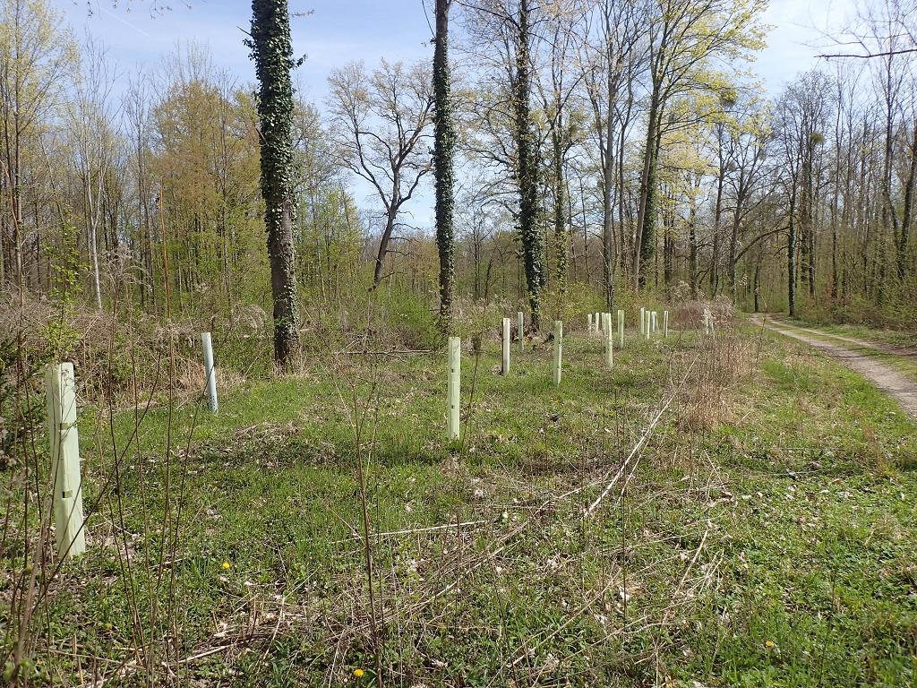 Bearbeitung des Oberbodens. Räumung der Biomasse/Totholz. Aufforstung in Reihenpflanzungen mit Plastik-Einzelbaumschutz. Darunter auch gebietsfremde Arten wie Eibe (Taxus spec.) und Baum-Hasel (Corylus colurna). Aufgrund erhöhter Sonneneinstrahlung und schlagartiger Veränderung des Mikroklimas Förderung von invasiven Neophyten wie Riesen-Goldrute (Solidago gigantea) und anderer, gebietsuntypischer Störzeiger..