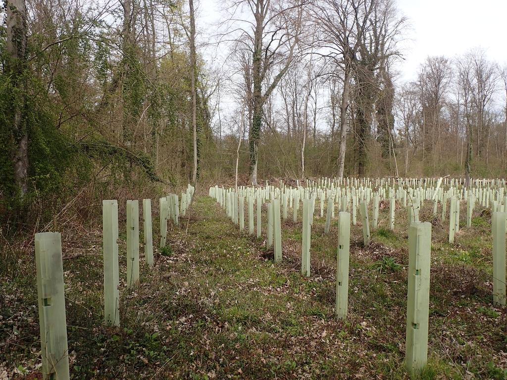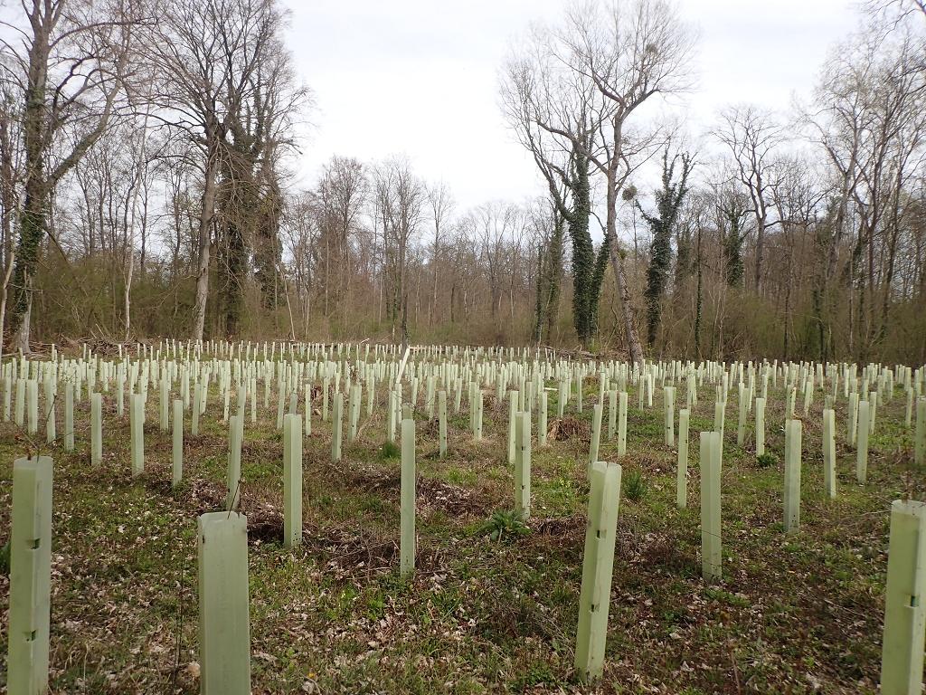 Bearbeitung des Oberbodens. Räumung der Biomasse/Totholz. Aufforstung in Reihenpflanzungen mit Plastik-Einzelbaumschutz. Darunter auch gebietsfremde Arten wie Baum-Hasel (Corylus colurna). Aufgrund erhöhter Sonneneinstrahlung und schlagartiger Veränderung des Mikroklimas Förderung von invasiven Neophyten wie Riesen-Goldrute (Solidago gigantea) und anderer, gebietsuntypischer Störzeiger. Austrocknung des Oberbodens. Größe: 0,25 ha.