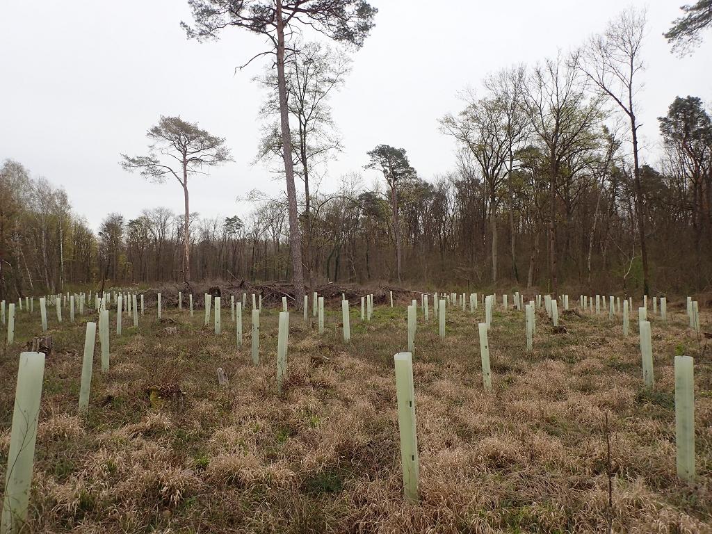 Bearbeitung des Oberbodens. Räumung der kompletten Biomasse/Totholz. Aufforstung in Reihenpflanzungen mit Plastik-Einzelbaumschutz. Darunter auch gebietsfremde Arten wie Baum-Hasel (Corylus colurna). Aufgrund erhöhter Sonneneinstrahlung und schlagartiger Veränderung des Mikroklimas Förderung von invasiven Neophyten wie Riesen-Goldrute (Solidago gigantea) und anderer, gebietsuntypischer Störzeiger wie z.B. Kleinblütige Königskerze (Verbascum thapsus). Größe: 0,25 ha. Gegenüber eines Fischweihers. Nebenan befindet sich weitere Kahlschlagfläche. Man könnte auch beide zusammen als 1 große Kahlschlagfläche auffassen. Zum Beobachtungszeitpunkt ist die Fläche schätzungsweise 3 Jahre alt.