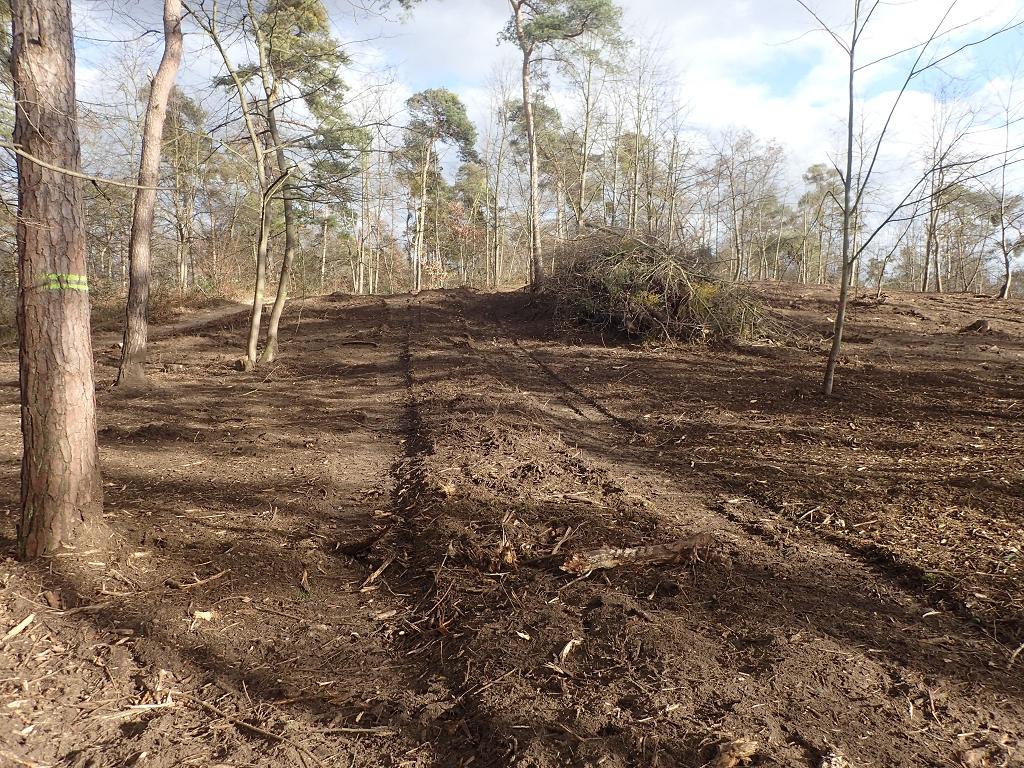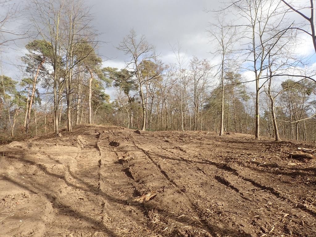 'Waldumbaumaßnahme' der Stadt Mannheim im "Großen Hallenbuckel" innerhalb des LSG Dossenwald, der vielerorts sehr durch Kiefern geprägt ist. Entnahme der Spätblühenden Traubenkirsche (mit Wurzeln) und Entfernung sämtlicher anderer Gehölze. Wenige, einzelne Exemplare von Wald-Kiefer oder Laubbäumen wurden nicht gefällt. Mehrfache Befahrung der Fläche abseits der Rückegassen. Wurzelabrisse und andere Schäden an den verbliebenen Kiefern. Komplette, intensive Bearbeitung des Oberbodens. Nahezu vollständige Räumung des Totholz von den Flächen. Äste-/Kronenmaterial und dünne Stämme der Traubenkirche wurden gehäckselt/gemulcht und teilweise in den Oberboden eingearbeitet oder auf einige Anhäufungen konzentriert. Umzäunung der Fläche. Aufforstung in Reihen mit z.T. gebietsfremden Arten. Unnatürliche Baumartenzusammensetzungen. Auch Schädigungen der Wege/Säume. Zerstörung eines wertvollen Dünenhangs ("Buckel").