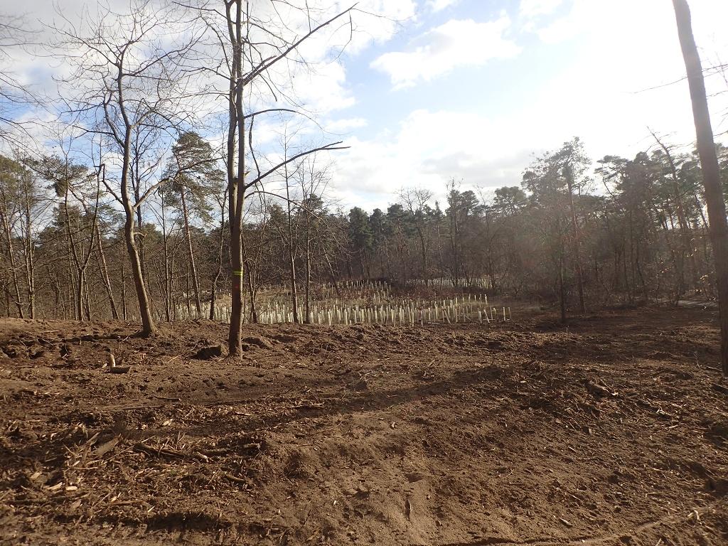 Direkt an diese Fläche gen Süden grenzt eine andere Kahlschlagfläche an, die zum Beobachtungszeitpunkt schätzungsweise 2 bis 4 Jahre alt war. Diese wurde mit einer 'bunten', artifiziellen Mischung an Baumarten aufgeforstet. Ohne Zaun, aber mit Plastikhüllen.