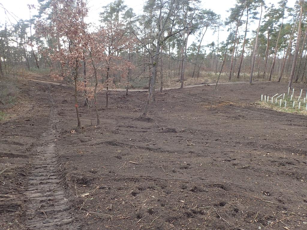 Entnahme der Spätblühenden Traubenkirsche (mit Wurzeln) und Entfernung sämtlicher anderer Gehölze. Wenige, einzelne Exemplare von Wald-Kiefer oder Laubbäumen wurden nicht gefällt. Mehrfache Befahrung der Fläche abseits der Rückegassen. Wurzelabrisse und andere Schäden an den verbliebenen Kiefern. Komplette, intensive Bearbeitung des Oberbodens. Nahezu vollständige Räumung des Totholz von den Flächen. Äste-/Kronenmaterial und dünne Stämme der Traubenkirche wurden gehäckselt/gemulcht und teilweise in den Oberboden eingearbeitet oder auf einige Anhäufungen konzentriert. Aufgrund der Hanglage wirkt hier die Erosion besonders stark. Direkt angrenzend eine ältere Kahlschlagfläche bzw. Monokultur mit der gebietsfremden Juglans regia.