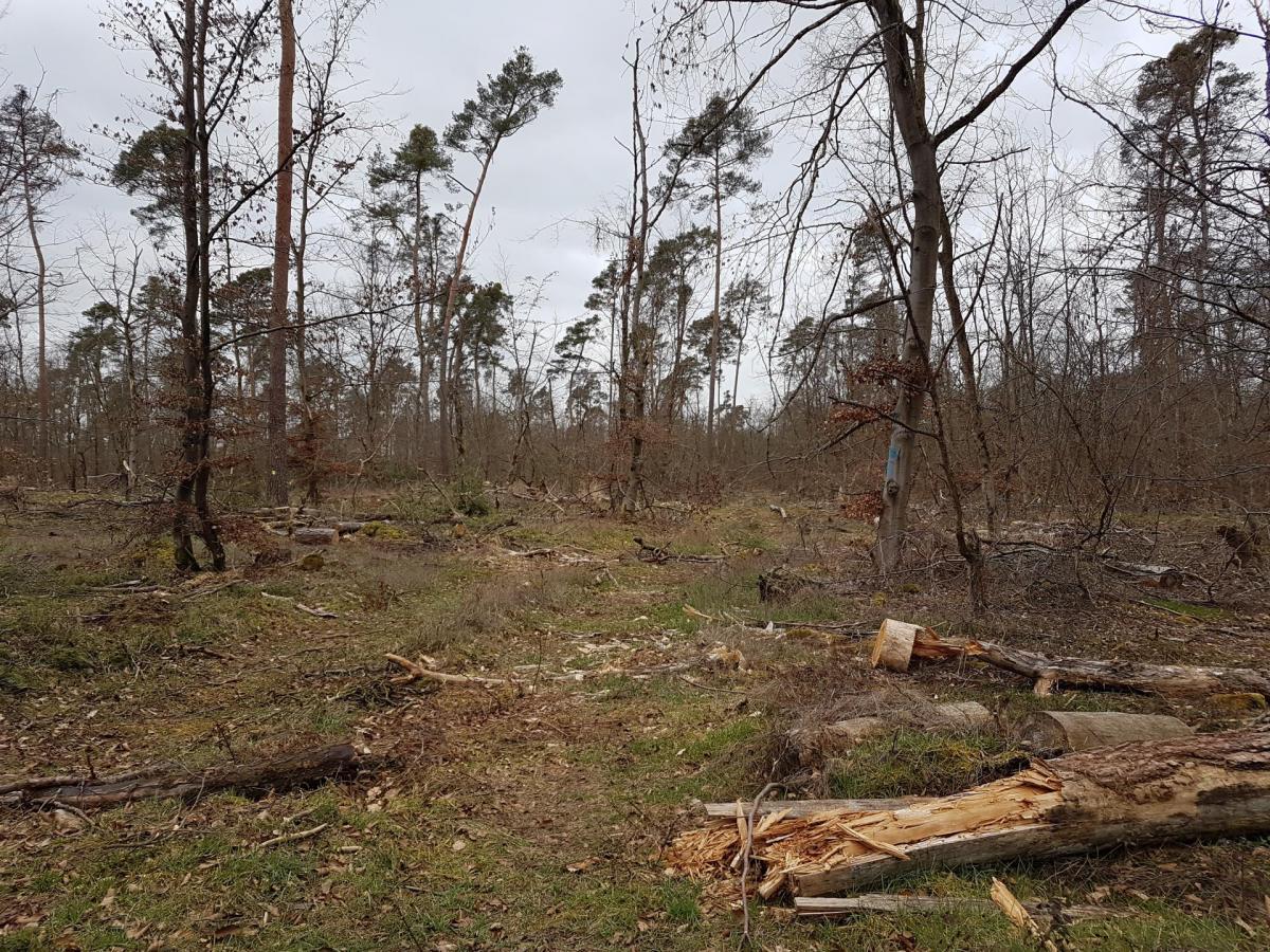 Im durch Trockenheit bereits geschädigtem Wald, massiver Einschlag mit schwerem Gerät, darunter viele gesunde, alte Laubbäume.