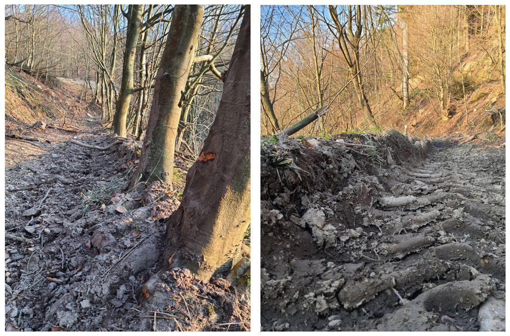Bodenschäden durch Befahrung mit schwerem Gerät bei aufgeweichten Böden. Die Maschinen sind mehrfach abgerutscht.