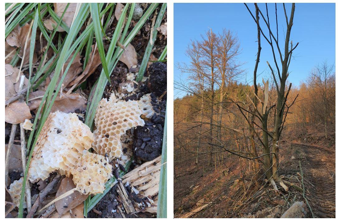 In einem hohlen alten Baum waren Bienenwaben enthalten (Bild 3). Diese alte große Buche wurde dennoch gefällt. Warum?
