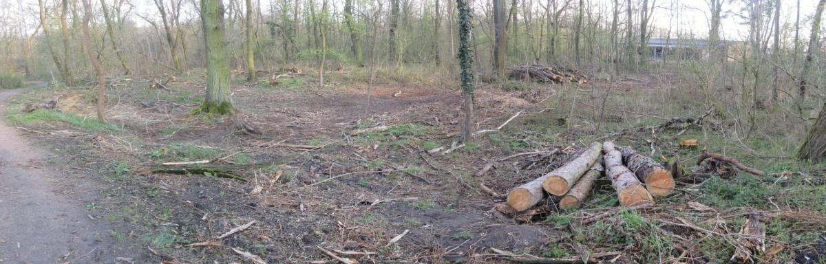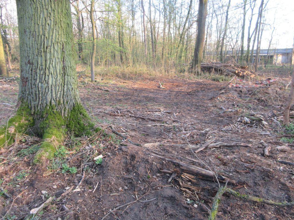 Bei der Dokumentation vor Ort am 14.04.2022 wurden diese Abholzungen mit vollständiger Entnahme der Stämme und des Kronenholzes festgestellt. Weiterhin Fahrspuren, schwere Bodenschäden, Schäden an der vorhandenen und verbleibenden Fauna und Flora, u.a. einer prägnanten Alteiche.