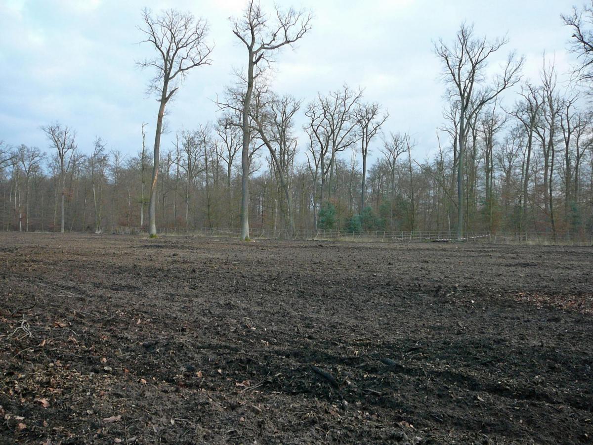 Nach 3,5 ha großem Kahlschlag in oberer Fläche (siehe Karte unten) wurde 2009 mit Hessen-Forst Lampertheim üblicher "Ackerbau"-Methode der Waldboden komplett durchgezackert und zerstört.