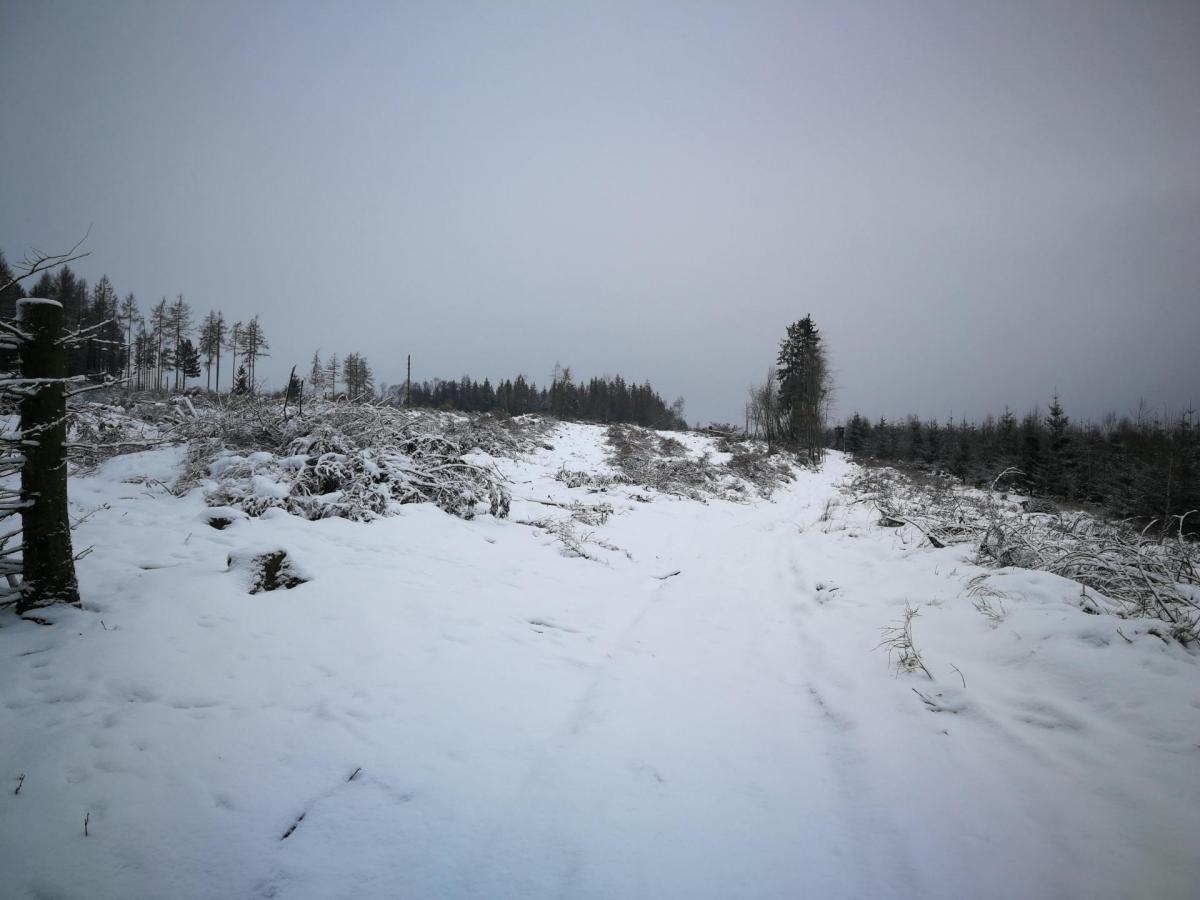Abräumen, massive Befahrung, totholz liegt, abet in haufen zwischen ruckegassen mit max. 10 Meter Abstand. Aufforstung Fichte in Reihe und Glied nebenan