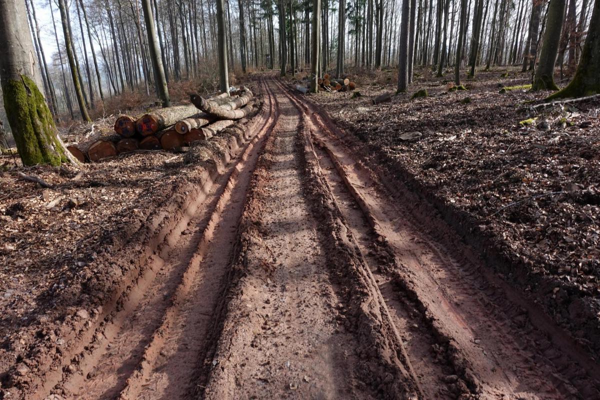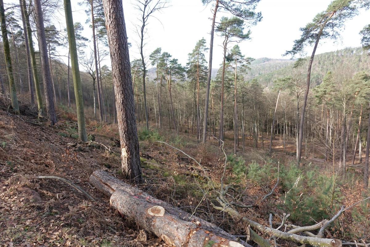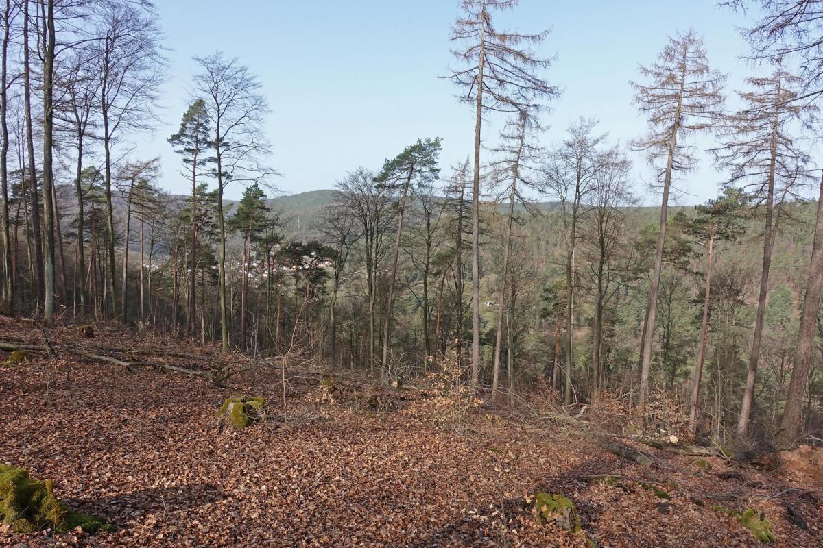 Herbst 2020, Iggelbach, Birnenberg-Nordhang. Bis auf einige wenige Fichten und Lärchen, fast totale Buchen-Abholzung (vorher dichtes Buchenwald).