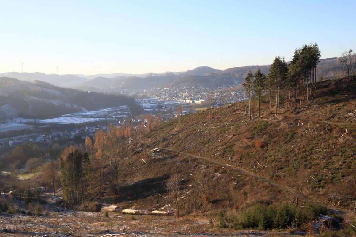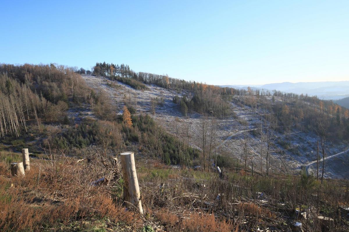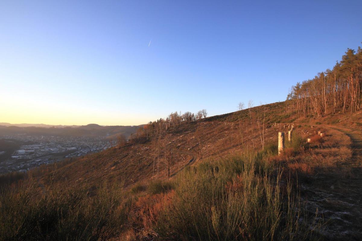 In einem Gebiet, welches sich vom Heide-Berg (495 m), über die "Faule Seite" (533 m) bis zum "Hardt" (513 m) erstreckt und gut 1 km² (100 Hektar) Fläche bedeckt, wurden ca. 70-75 % Nadelbäume durch Kahlschläge entfernt.