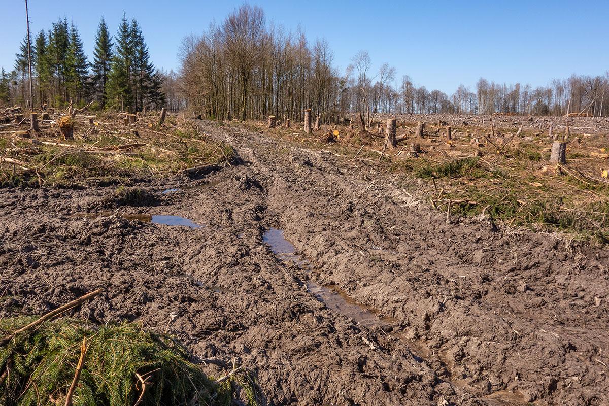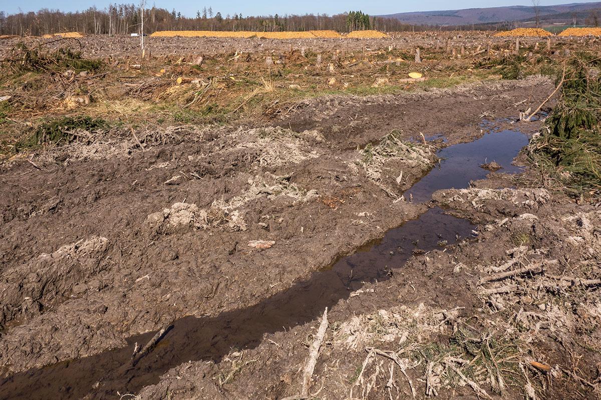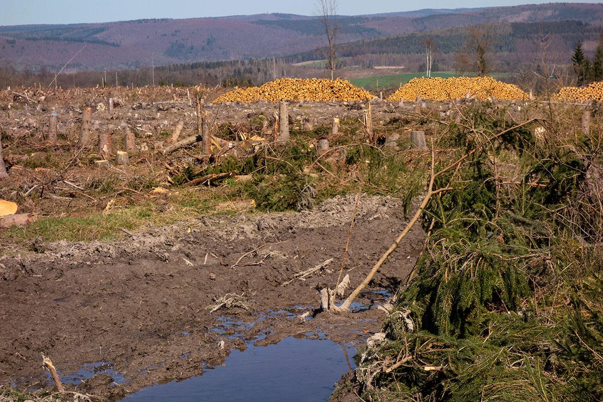 Der Sturm Friederike hat am 18. Januar 2018 südöstlich von Helmarshausen (Bad Karlshafen) rd. 30 ha Fichten umgeworfen. Die Sturmwurffläche wurde von Hessen-Forst an einen privaten Selbstwerber verkauft und von diesem vollständig geräumt. An den Wegrändern stapeln sich gigantische Holzpolter. Das Holz kann wegen des riesigen Angebots an Sturmholz mangels Nachfrage nicht verkauft werden. Die Bringungsschäden durch die Harvester sind enorm. Der sensible Waldstandort wurde massiv geschädigt. Dabei gibt es naturverträgliche Alternativen: siehe Hagge, J., Leibl, F., Müller, J., Plechinger, M. & Thorn, S.(2019): Streifenförmige Entrindung bekämpft Buchdrucker in bereits befallenen Fichten. – ANLiegen Natur 41(1): https://www.anl.bayern.de/publikationen