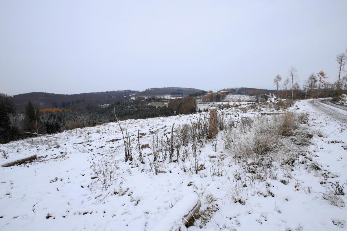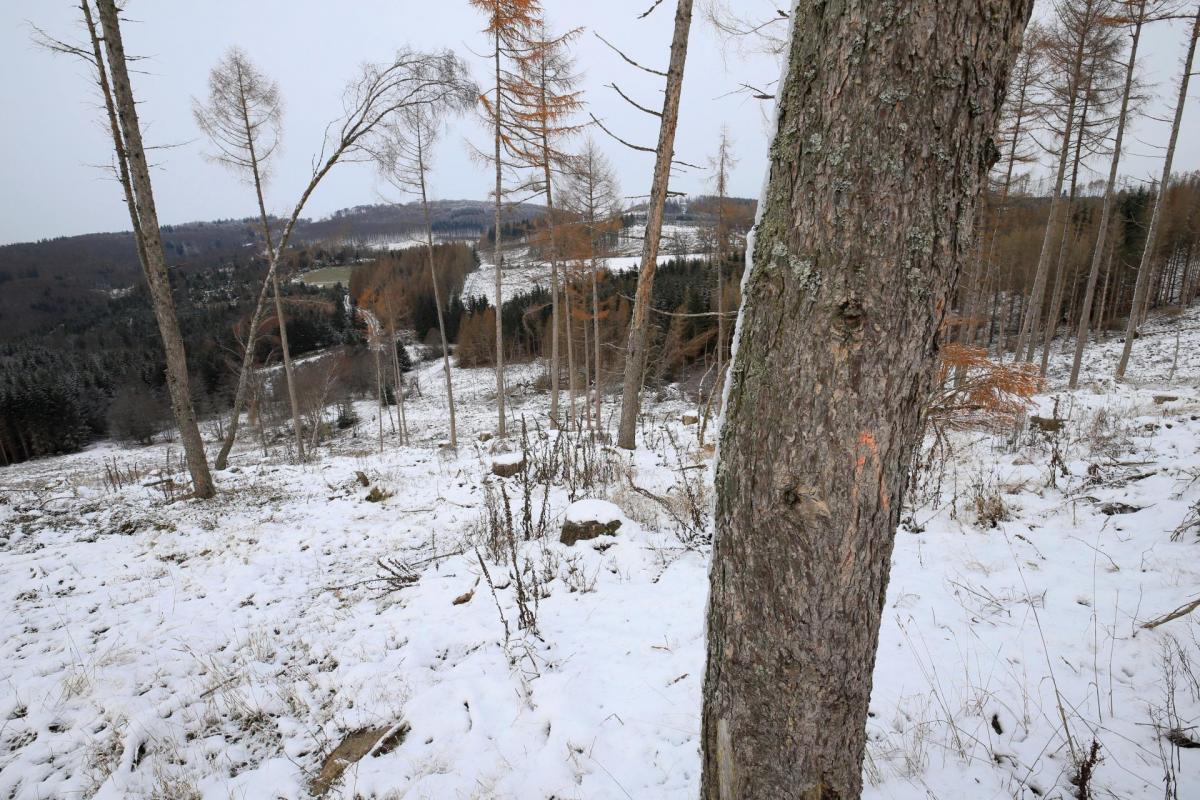 Auf einer Fläche von ca. 30 Hektar erfolgte der Kahlschlag von Fichten auf beiden Seiten des Weges. Kurz nach "Birkeacker" bis "Prinzseifen" und unterhalb "Schweinskaute" bis vor "Harfelder Grund". Der tatsächliche Einschlag kann durchaus noch größer sein, da nur die Flächen per www.tim-online.de vermessen wurden, die vom Wege aus sichtbar waren.