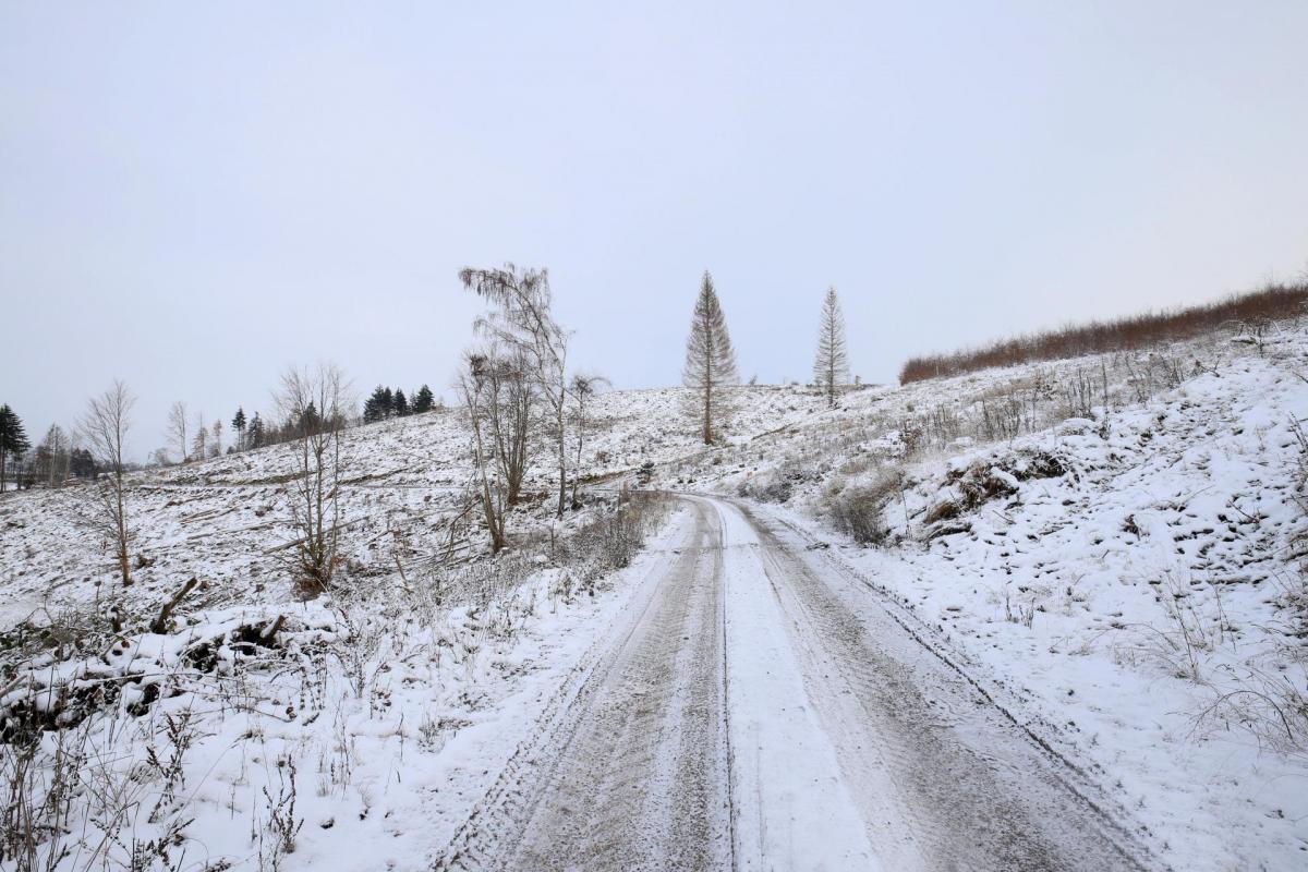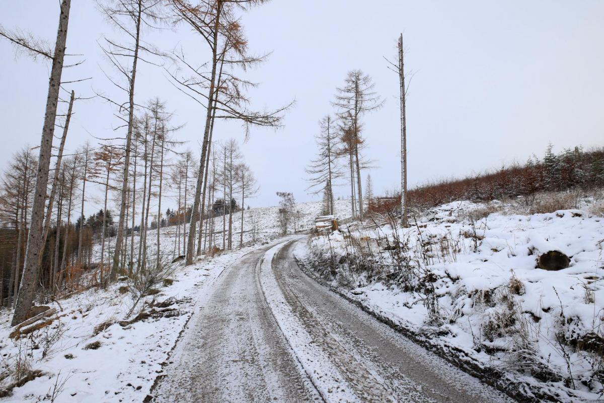 Auf einer Fläche von ca. 30 Hektar erfolgte der Kahlschlag von Fichten auf beiden Seiten des Weges.