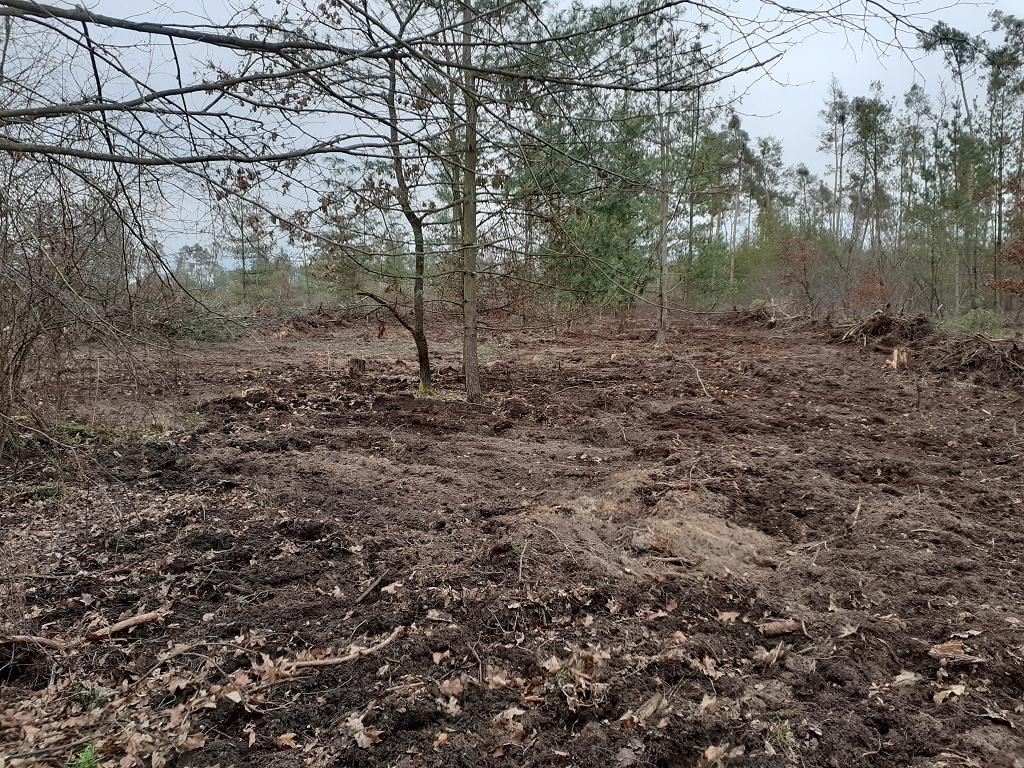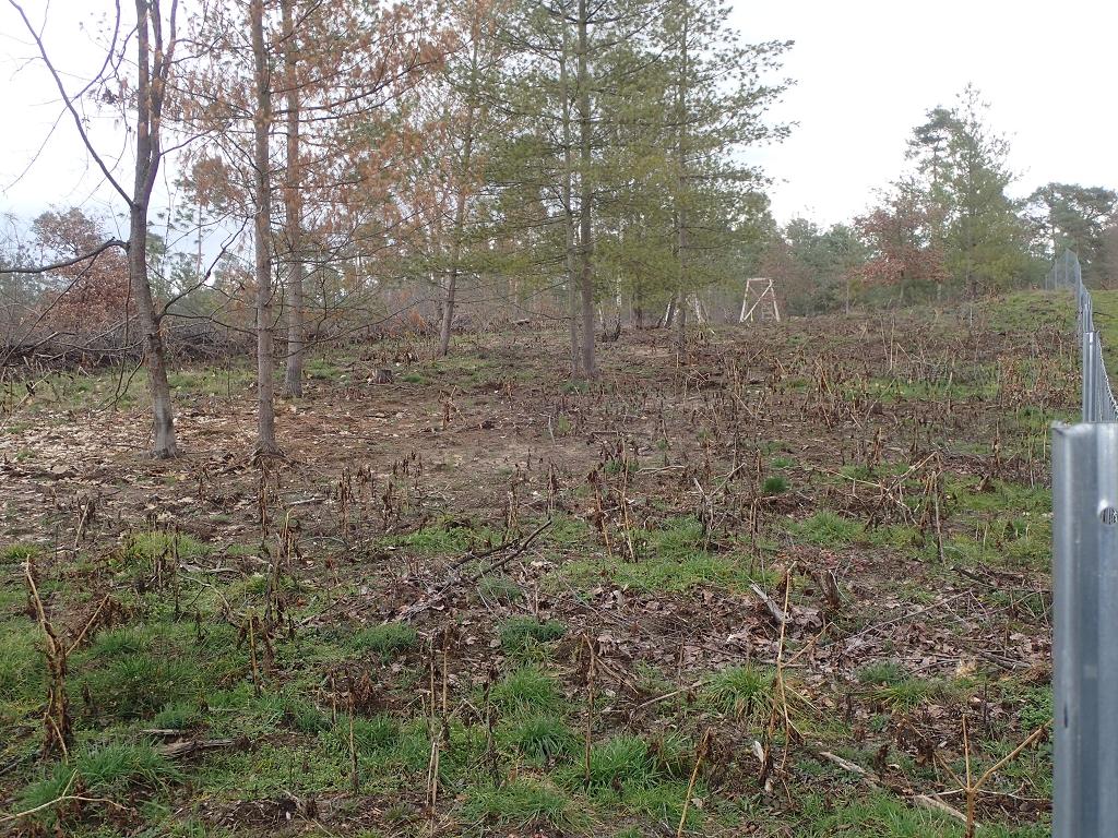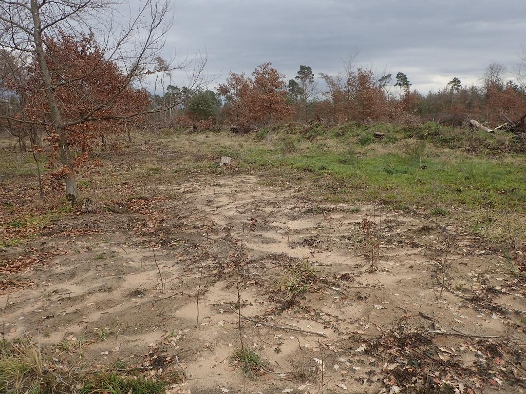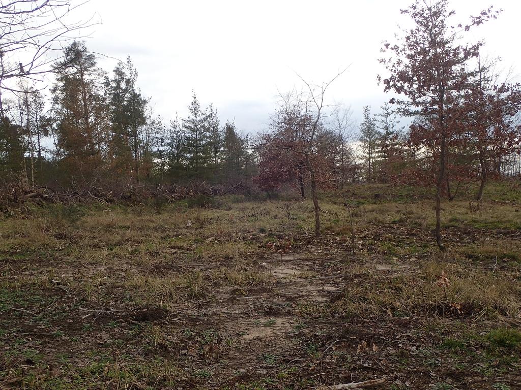 Fläche wurde bis auf wenige Bäume kahlgeschlagen. Stehen gelassen wurden relativ junge Stiel-Eichen und Weymouth-Kiefern (Pinus strobus), die vor schätzungsweise 30-40 Jahren gepflanzt wurden. Weymouth-Kiefern haben Mangelerscheinungen (Nadelfarbe).