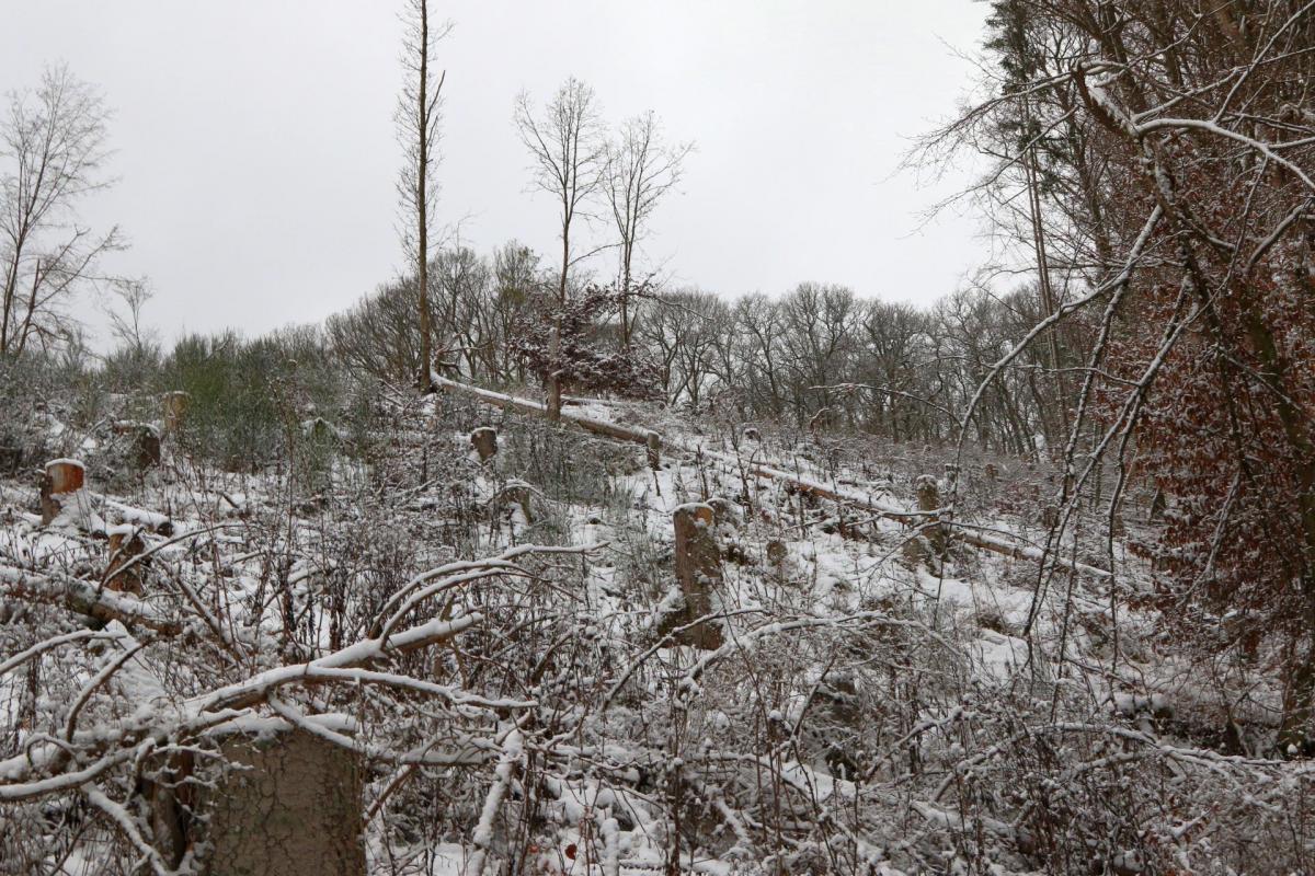 Kahlschlag an der Flanke des "Hundskopf" in östlicher und südlicher Richtung auf einer Fläche von ca. 1,6 Hektar.