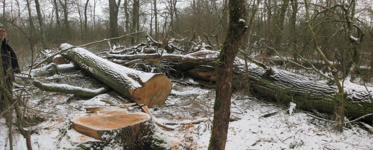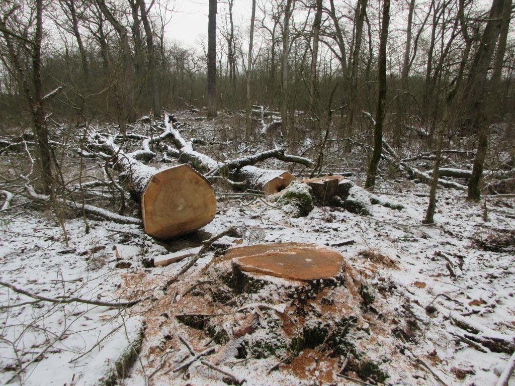 Kahlschlag - ohne Rücksicht auf Flora und Fauna. Die erst kürzlich gefällten Bäume lagen noch überwiegend an Ort und Stelle - Chaos und Verwüstung! Bäume mit Spechthöhlen, Heldbockbesatz, Eremit, Fledermausquartiere...? Der Abtransport folgt - mit schwerer Technik auf den empfindlichen Waldböden? Jetzt schon schwere Bodenschäden, tiefe Fahrspuren!