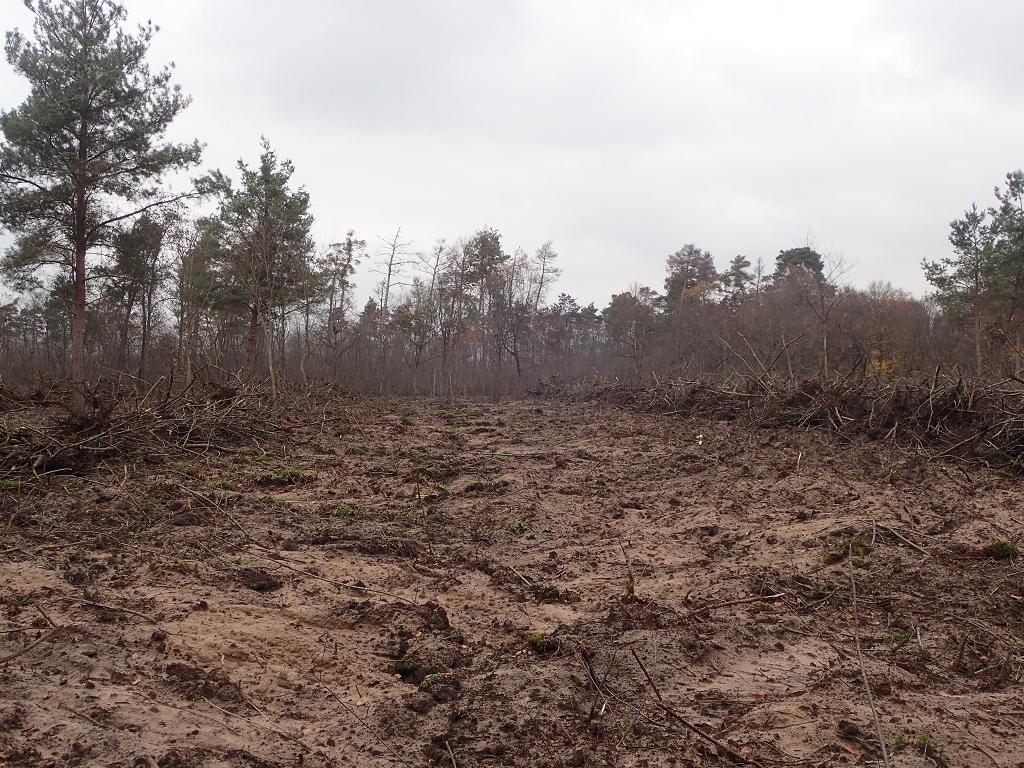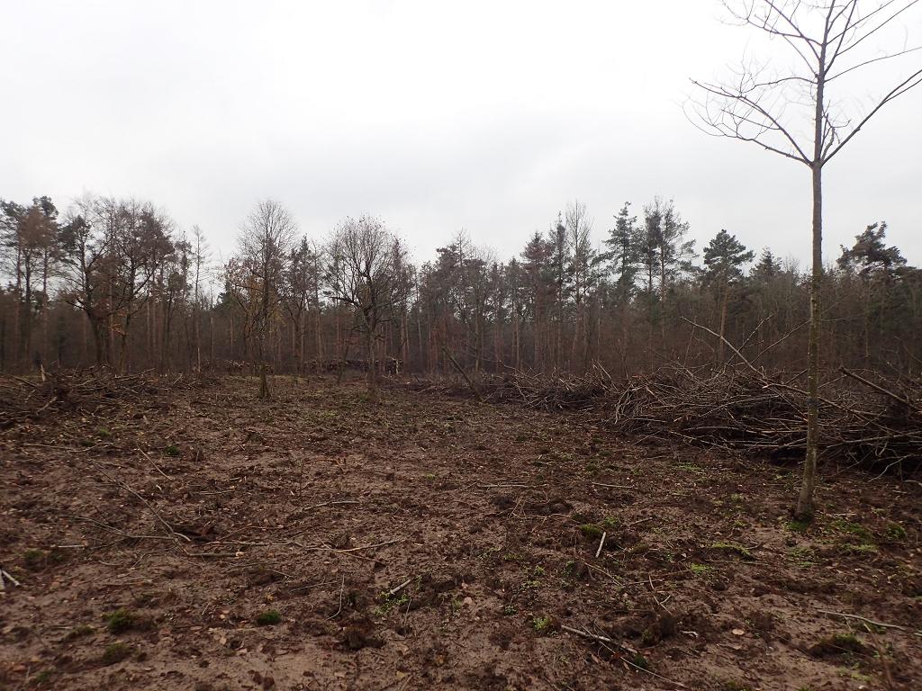 'Waldumbau' durch ForstBW im Staatswaldanteil des Käfertaler Walds. Größe der Fläche ca 1,5 ha. Man hat versucht, die Spätblühende Traubenkirsche (mit Wurzeln) zu entfernen. Dabei wurden im durch Kiefern dominierten Bestand auch bis auf wenige Exemplare die Kiefern gefällt. An Randbereichen wurden einzelne Laubbäume wie Rot-Buche, Hainbuche und Winter-Linde stehen gelassen. Ansonsten Kahlschlag. Vollfläche Bearbeitung des Oberbodens. Abstände Rückegassen zu gering (</= 20 m). Befahrung auch außerhalb der Rückegassen. Sämtliche Biomasse (Totholz) wurde von der Fläche geräumt bzw. Ast-/Kronenmaterial wurde auf die Befahrungslinien geschoben. Mehrere Verstöße bzw. Abweichungen von Indikatoren des FCS-Standards 3-0.