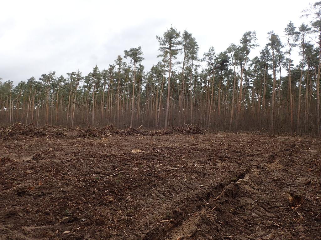 Kahlschlag eines Kiefern-Bestands, eingestreut heimische Laubbäume. Unterwuchs war durchsetzt mit Prunus serotina. Vollflächige Befahrung und Pflügung der Fläche. Anschließend Aufforstung mit Wald-Kiefer und Umzäunung der Fläche.