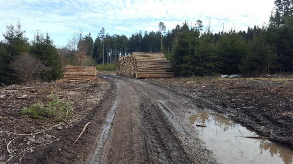 Kahlschlag und Bodenschäden (tiefe Fahrrinnen) im Waldgebiet Bucher Graben zwischen Eugenbach und Furth.
