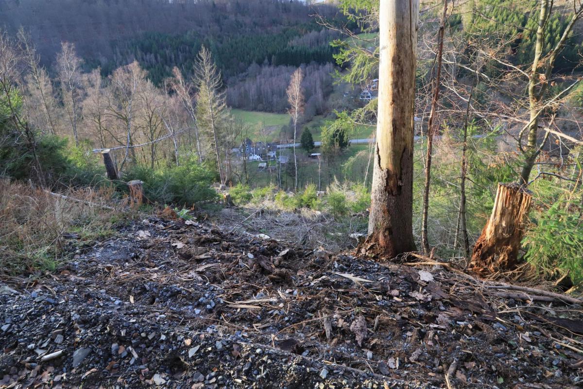 Kahlschlag auf einer Fläche von ca. 2,2 Hektar. Hang abwärts, unterhalb "Unterm Obernberg" (Kapp), oberhalb "Binger Wiese" an der L718.