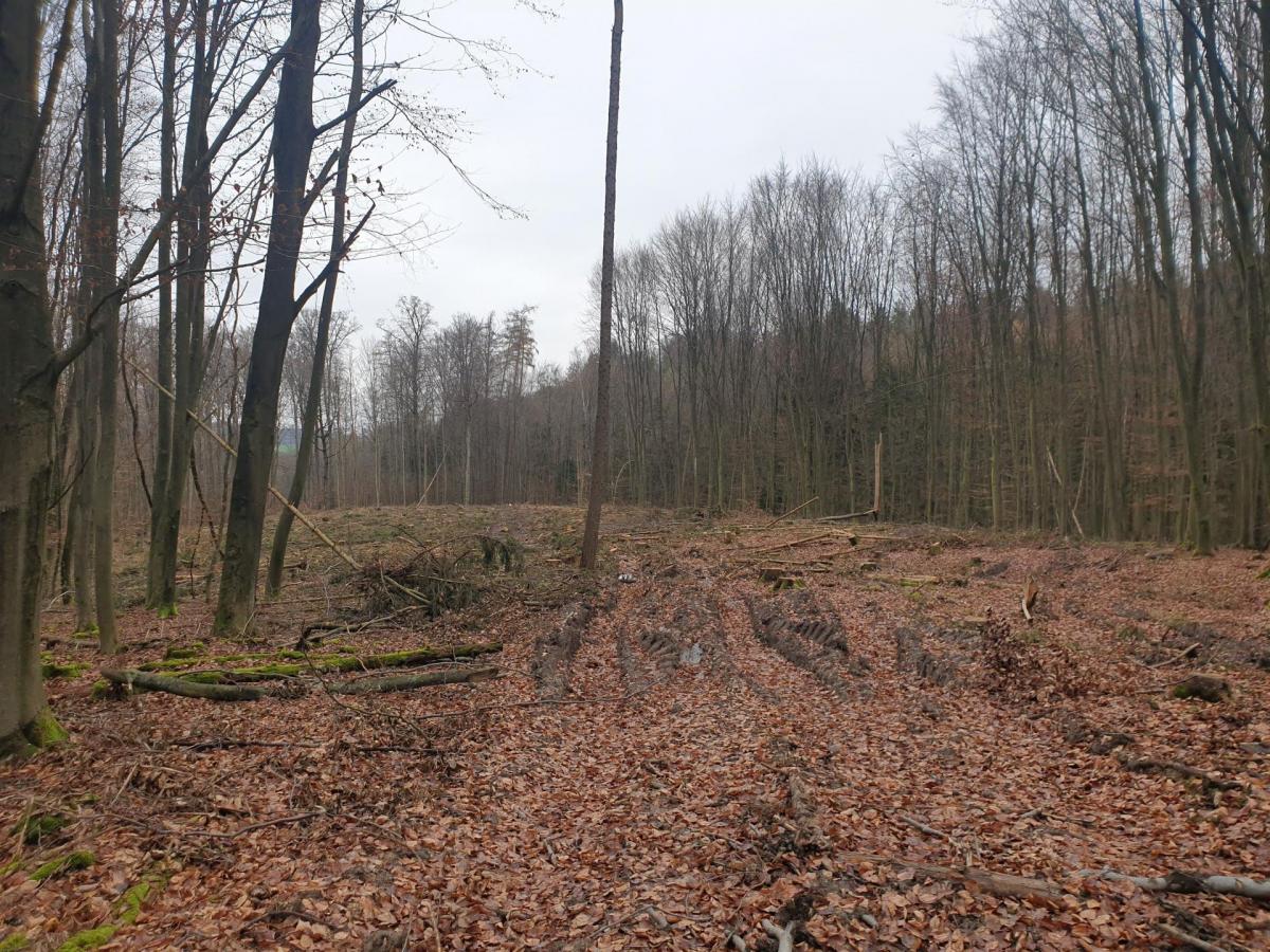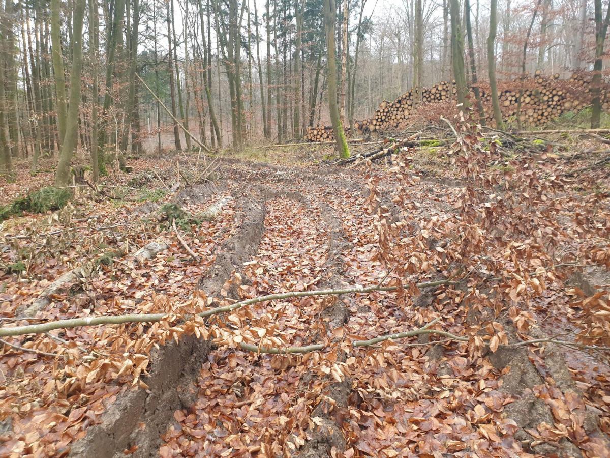 Kahlschlag mit tiefen Harvesterspuren.