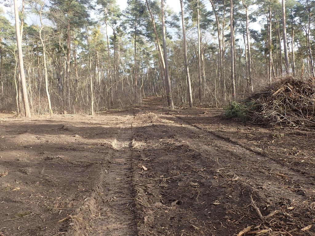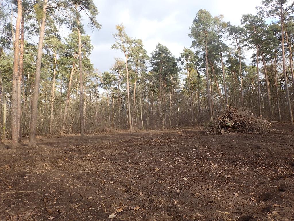 'Waldumbaumaßnahme' der Stadt Mannheim im "Großen Hallenbuckel" innerhalb des LSG Unterer Dossenwald u. FFH-Gebiet 6617-341, der vielerorts sehr durch Kiefern geprägt ist. Entnahme der Spätblühenden Traubenkirsche (mit Wurzeln) und Entfernung sämtlicher anderer Gehölze. Wenige, einzelne Exemplare von Wald-Kiefer oder Laubbäumen wurden nicht gefällt. Mehrfache Befahrung der Fläche abseits der Rückegassen. Wurzelabrisse und andere Schäden an den verbliebenen Kiefern. Komplette, intensive Bearbeitung des Oberbodens. Nahezu vollständige Räumung des Totholz von den Flächen. Äste-/Kronenmaterial und dünne Stämme der Traubenkirche wurden gehäckselt/gemulcht und teilweise in den Oberboden eingearbeitet oder auf einige Anhäufungen konzentriert. Aufforstung in Reihen mit z.T. gebietsfremden Arten. Auch Schädigungen der Wege/Säume.