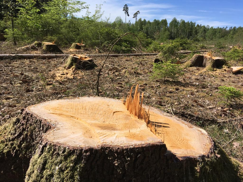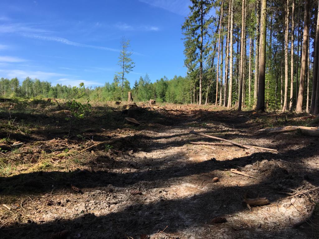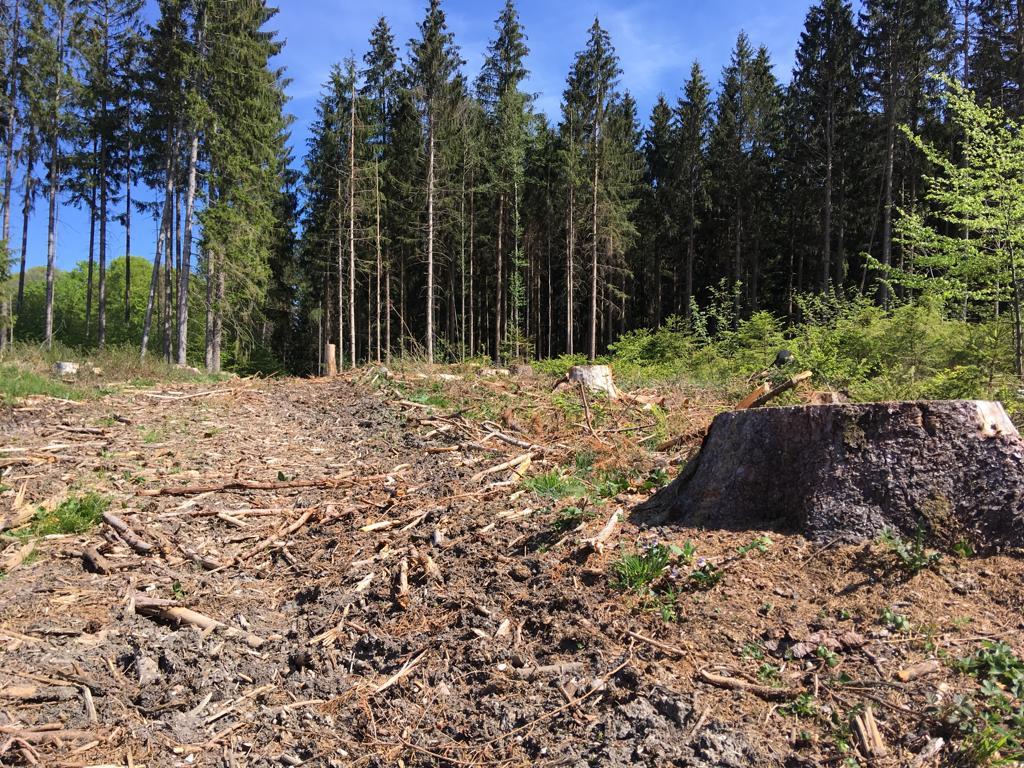 Kahlschlag von mind. 200 Jahre alten, einzeln stehenden gesunden Nadelbäumen (überwiegend Fichte); Beträchtlicher Bodenschaden durch schweres Abholzungsgerät (tiefe Fahrrinnen); Die gefällten Bäume waren weder von Borkenkäfer befallen, noch waren sie durch Sturmschäden beschädigt.