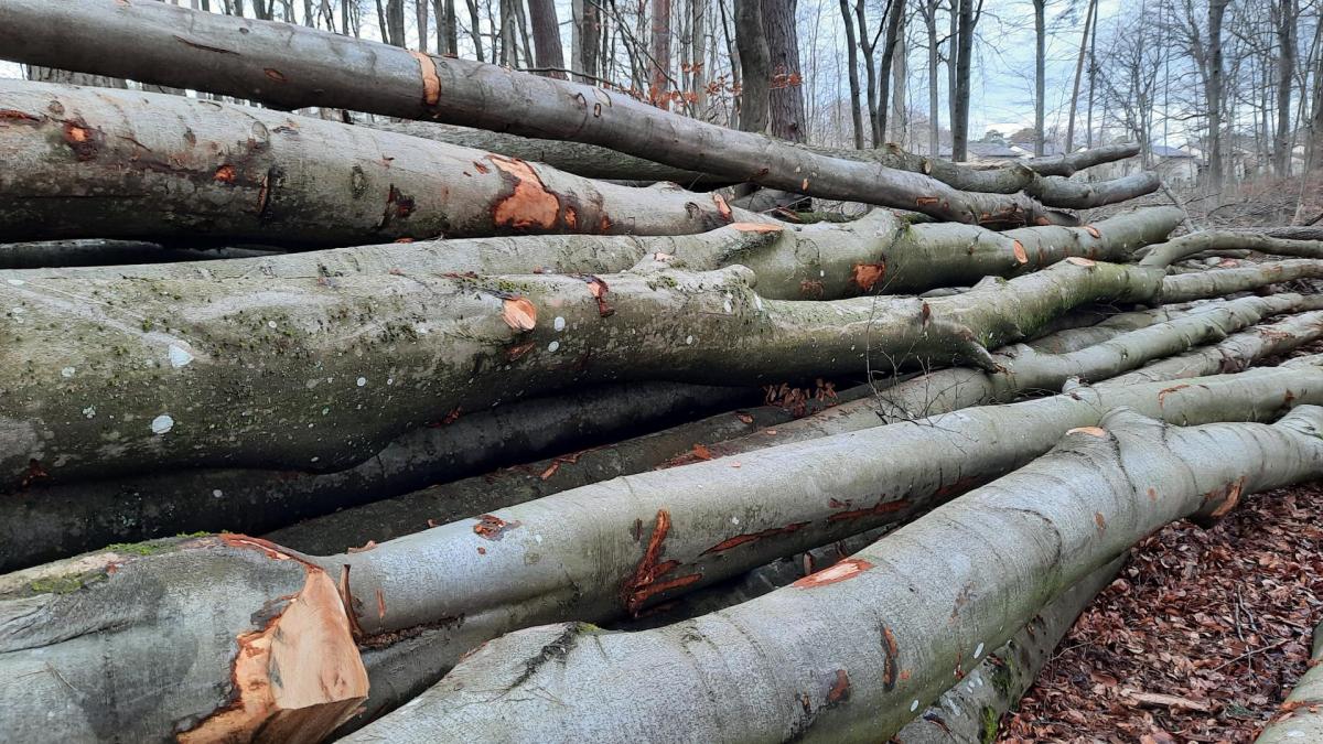 Hier: Viele, viel zu junge Buchen wurden eingeschlagen. Das Geäst wird nach der Abholung der Stämme - wie immer - liegen bleiben. Unser Forst hinterlässt kahle Waldflächen und kaputte Wege.