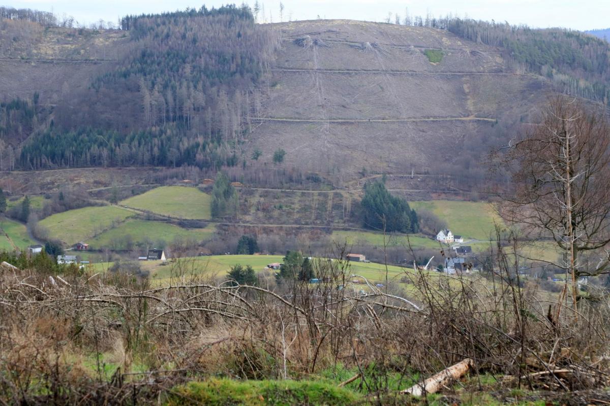 Kahlschlag auf ca. 1,5 Hektar. Waldstück ist bereits mit einer Ökokonto Maßnahme belegt.
