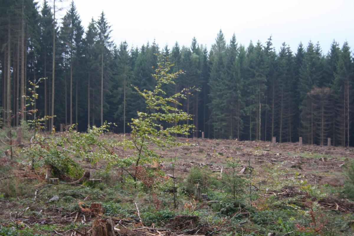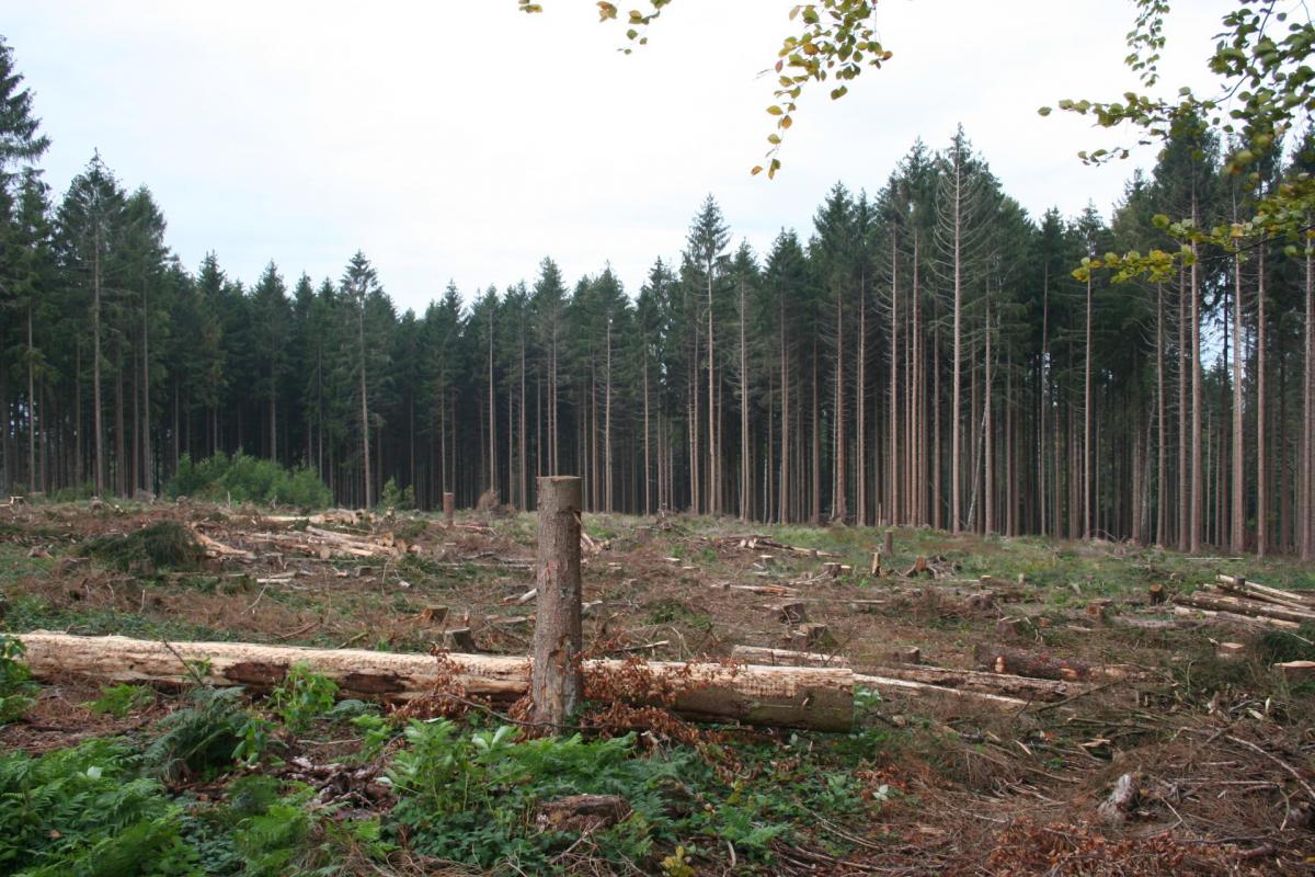 "Aufräumarbeiten" Rund um Thiels Hütte. Die meisten der noch stehenden Bäume im Hintergrund sind auch schon markiert