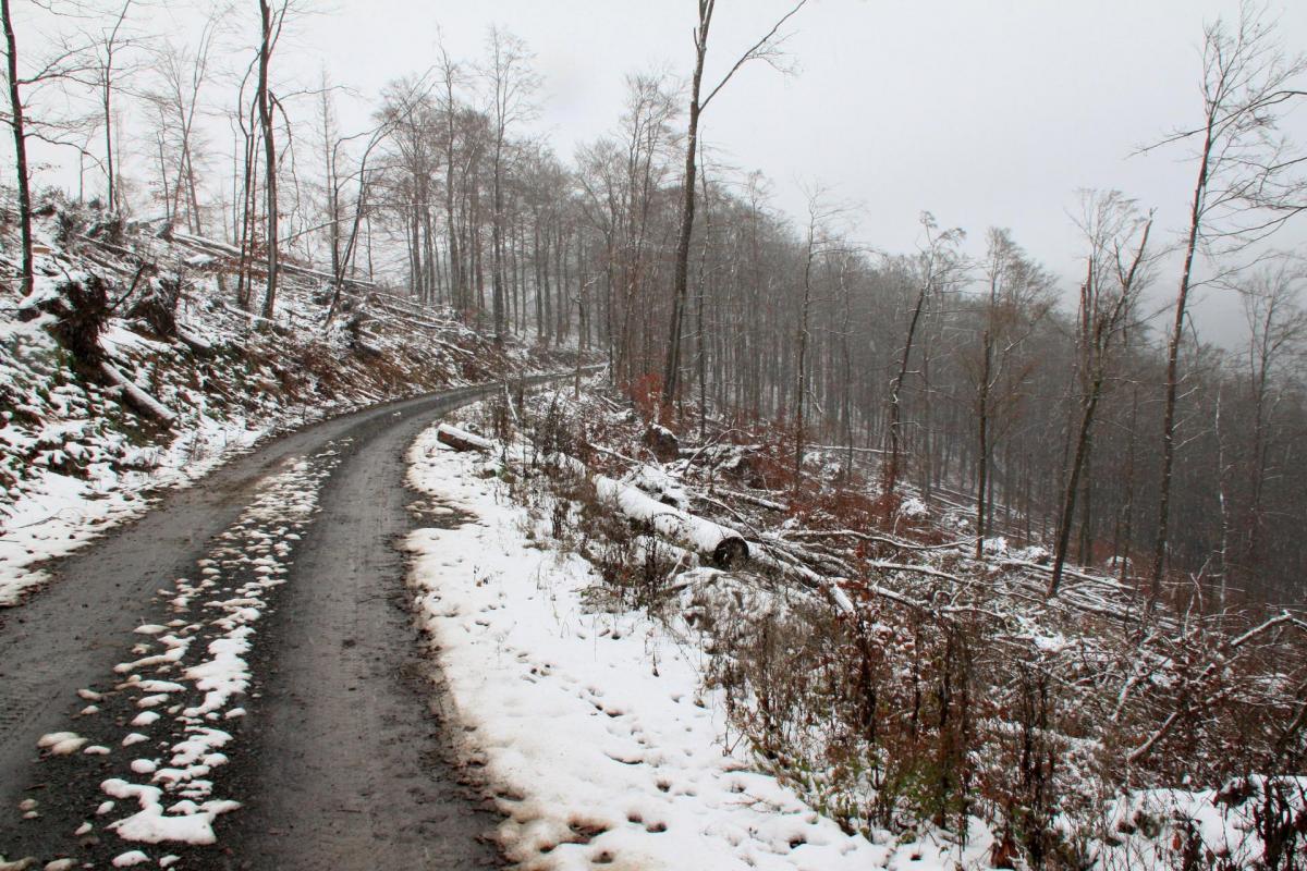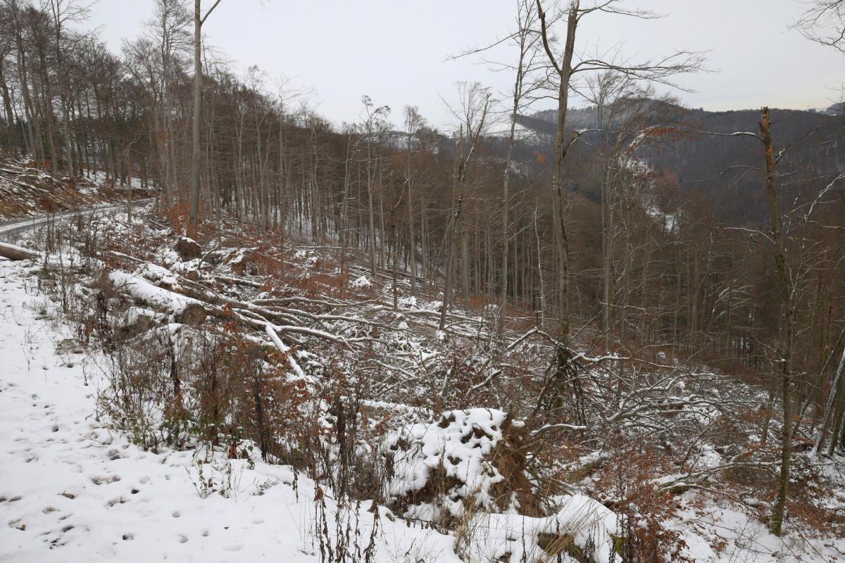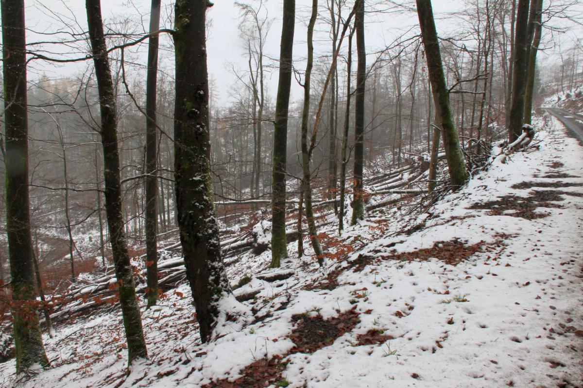 Bedingt durch einen Kahlschlag am angrenzenden Berghang (Hainrot 619 m), wurden durch einen Sturm einige Buchen talwärts des Weges entwur