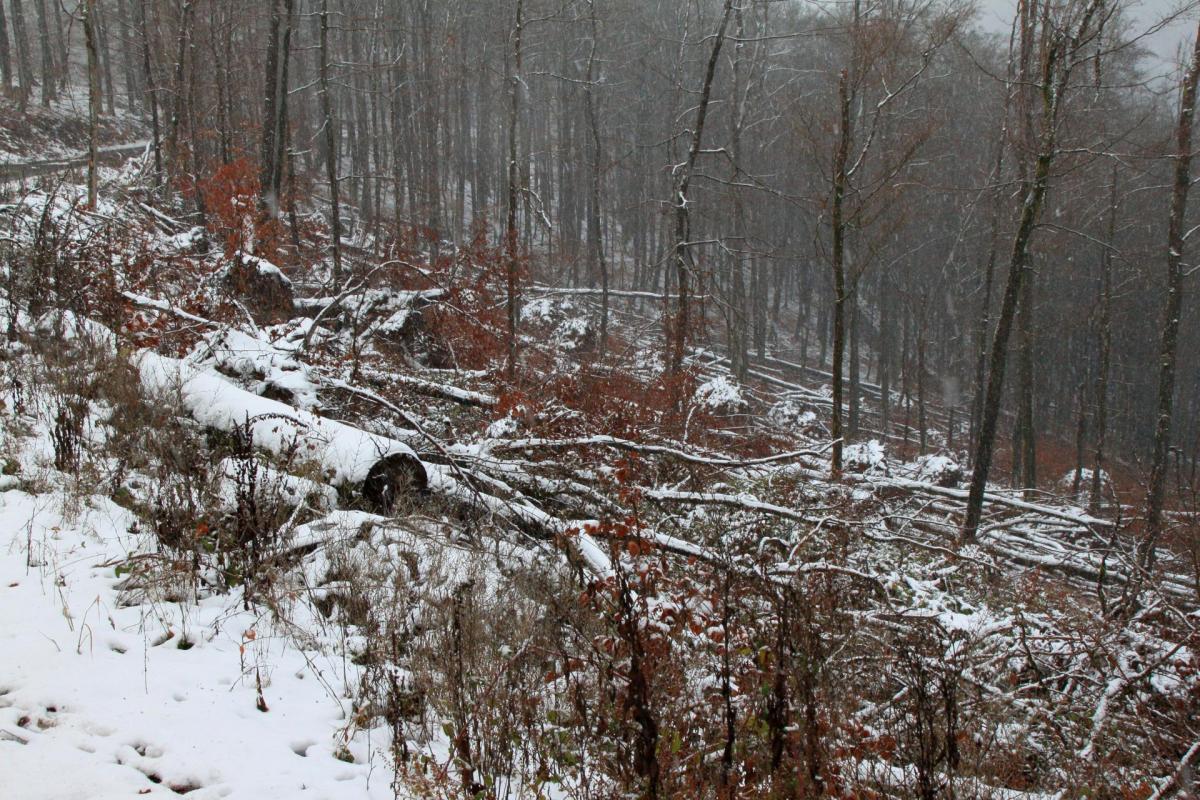 Bedingt durch einen Kahlschlag am angrenzenden Berghang (Hainrot 619 m), wurden durch einen Sturm einige Buchen talwärts des Weges entwurzelt. Der entsprechende Kahlschlag wurde bereits in den Einträgen: Kahlschläge rund um die Wegespinne, NW von Puderbach (Hainrot 619 m) und Kahlschlag auf dem Hainrot (619 m) thematisiert.