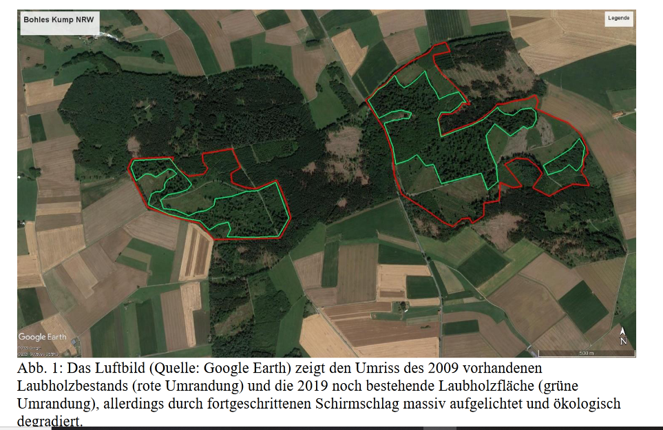 Es handelt sich um zwei geschlossene Laubwald-Teilkomplexe im Gebiet „Bohles Kump“ westlich und östlich der K 65 nördlich der Ortschaft Heddinghausen. Die Bestandsflächen (2009) umfassten nach eigenen Berechnungen im Westteil rund 26 Hektar und im Ostteil rund 63 Hektar. Eine Satellitenbildauswertung ergab, dass die westliche Laubholz-Bestandfläche 2019 nur noch 14 Hektar, die östliche Bestandsfläche nur noch 28 Hektar umfasste. Mithin wurde in der Summe innerhalb von 10 Jahren mehr als die Hälfte des Laub-Altholzbestands komplett beseitigt. Die kahlgeschlagenen und geräumten Flächen wurden größtenteils mit Fichten und Douglasien aufgeforstet. Nach bisherigen Kenntnissen befinden sich die Flächen in privatem Waldbesitz.