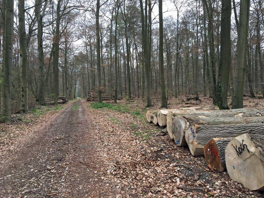 Ausgerechnet im wertvollen älteren Buchenmischwald, der deswegen am Wegrand fast nur noch geschädigte Bäume aufweist, die dann notgefällt werden.