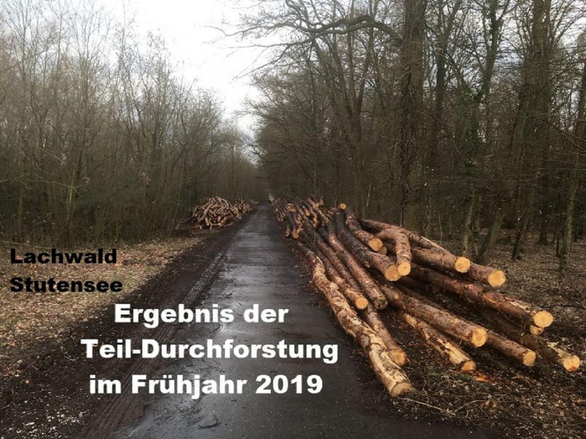 Nach Auffassung der Bürgerinitiative wurde die Bindungswirkung dieses Bürgerentscheids von der Stadt Stutensee sowie der Aufsichtsbehörde beim Regierungspräsidium Karlsruhe nicht im vollen Umfang – bezüglich der Frage über den Erhalt des Lachwalds in seiner jetzigen Form – beachtet. Denn bereits im Herbst 2018 wurde eine Durchforstung mit beabsichtigtem Waldumbau (= Formveränderung) vom Gemeinderat beschlossen. Dies führt im Jahr 2019 dazu, dass im Lachwald im Frühjahr und nochmal im darauffolgenden Herbst insgesamt das 6,5-fache Holz pro Hektar im Vergleich zum Bundesdurchschnitt geerntet werden wird.