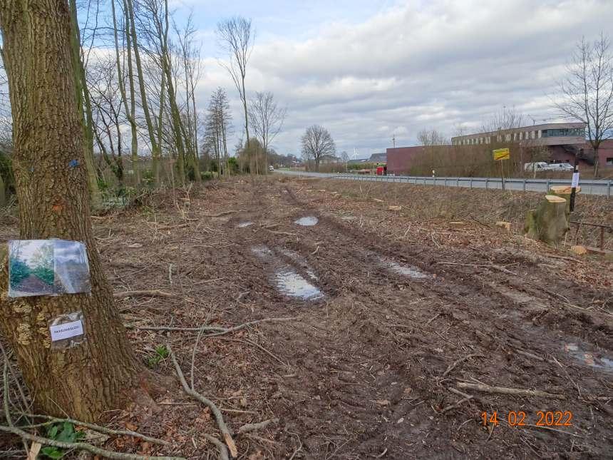 Nach einer profitorientierten Holzbeschaffung - Kahlschlag eines kleinen Schutzwäldchens vor einer Wohnsiedlung in Horstmar im Frühjahr 2022 ist nun genau gegenüber ein weiterer Kahlschlag - wieder mit Unterstützung durch den Landesbetrieb "Wald und Holz NRW" - geplant!:
