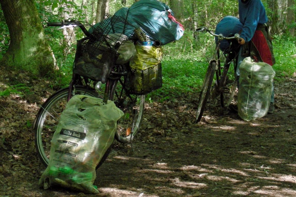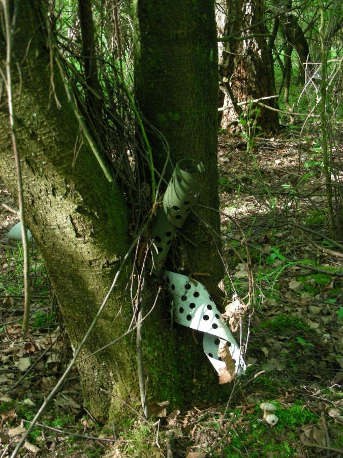 Die Plastik-Verbissschutzhüllen der Aufforstung von 1995 sind inzwischen mit den Bäumen verwachsen. Sie führen zu Schäden am Baum und verbleiben als allmählich zerfallendes Plastik im Wald.