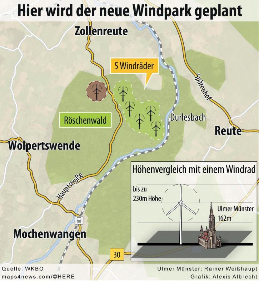 Im nördlichen Röschenwald, einem Teil des Altdorfer Waldes, soll östlich der Landesstraße 284 zwischen Mochenwangen und Zollenreute ein Windpark mit fünf Windrädern entstehen. Ursprünglich wurde jedoch mit sechs Windrädern geplant.